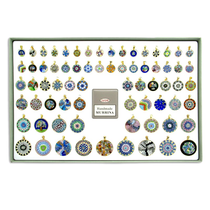 Exhibitor to Showcase for Millefiori Pendants ( 48x28x2 cm ) The Price included : 16 pcs diam.14 - 16 pcs diam.18 - 12 pcs diam.23 - 10 pcs diam.26 - 8 pcs diam.32 - 9 pcs diam.36 - Total 71 Pieces Murrina Pendants, with Box or Velet Pouch, and Certificate Murano Glass (chain not included) Made of Sterling Silver 925