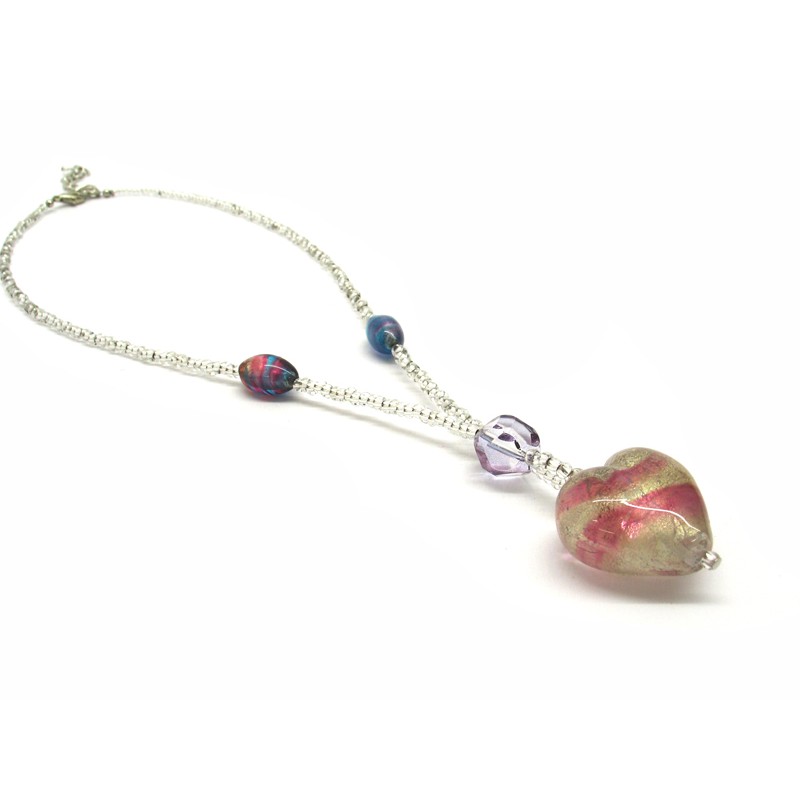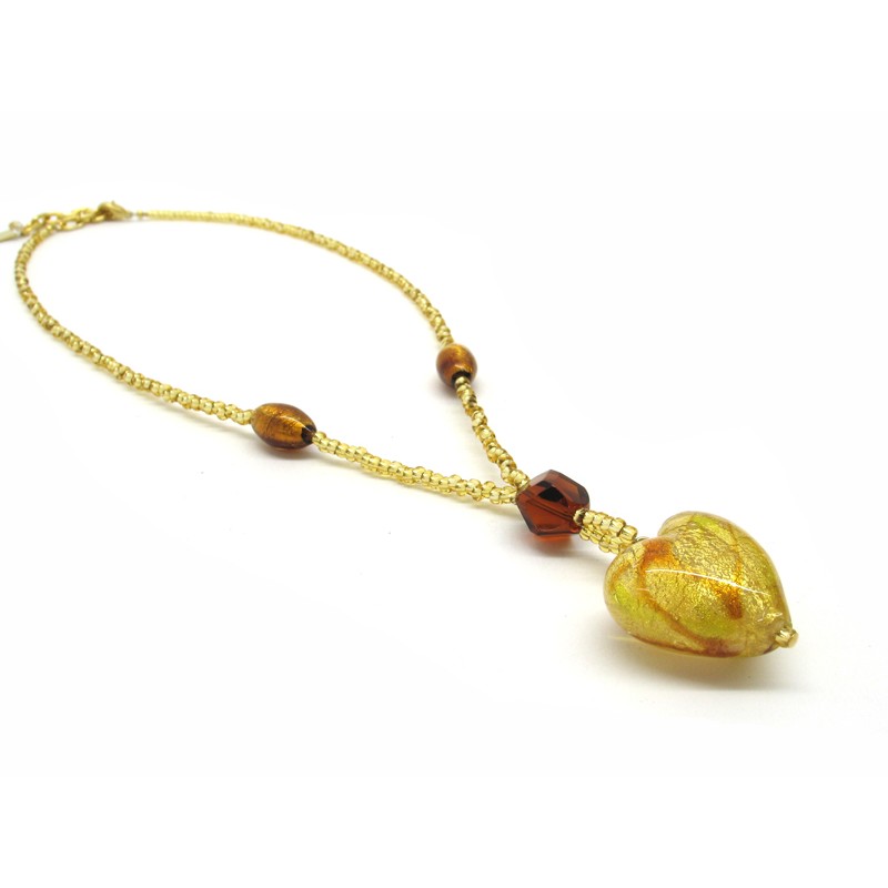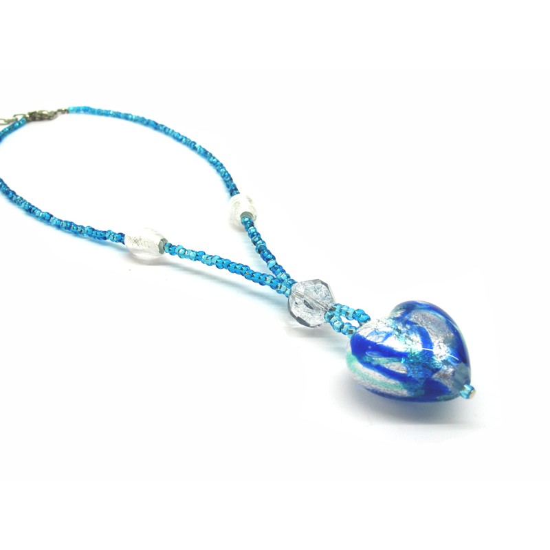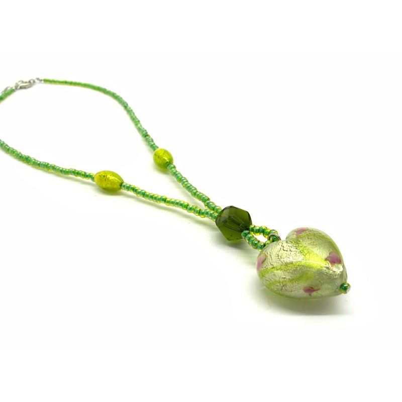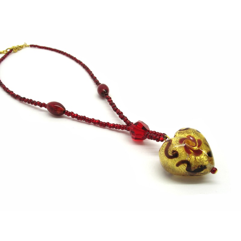 Necklace with Heart in Murano Glass, Mod. Giulia (45 cm) Heart 26x16 mm in diameter, made with a seed beads (conteria) necklace, available in 6 colours, with insertions foil, in Silver 925 and Gold 24 kt, made entirely handmade by Murano master glass-makers with the lampwork technique, in our Factory in Murano Venice - Italy.