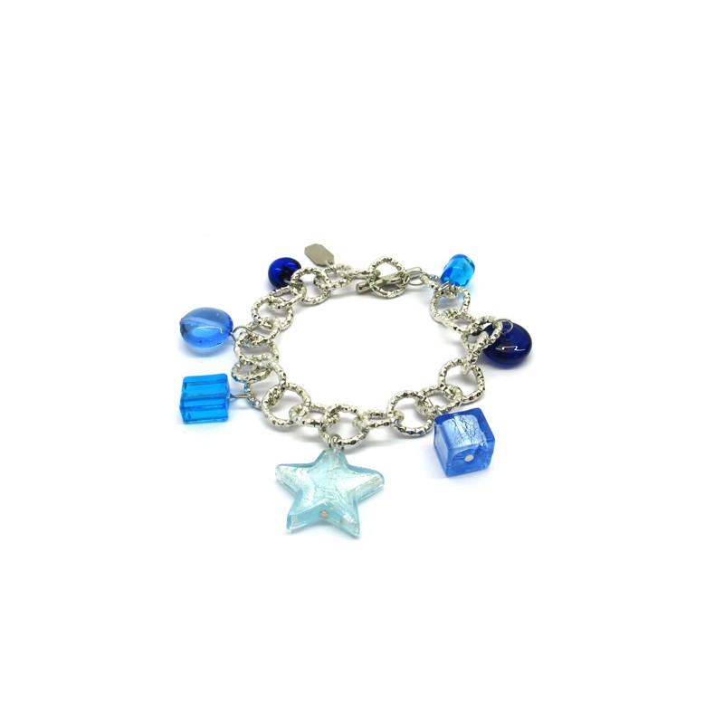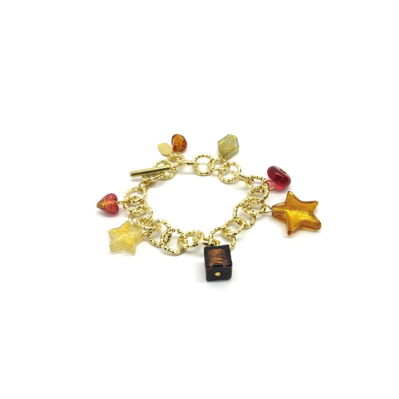 Murano Glass Bracelet in Aluminum, Mod. Charms (21 cm) available in Plating Gold and Chrome aluminum, made with assorted beads, with insertions foil, in Silver 925 and Gold 24 kt, made entirely handmade by Murano master glass-makers with the lampwork technique, in our Factory in Murano Venice - Italy.