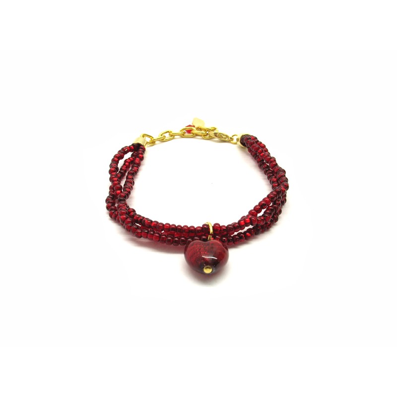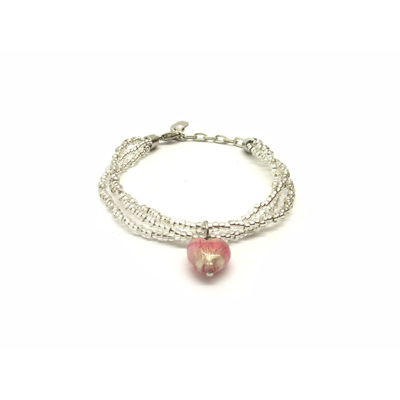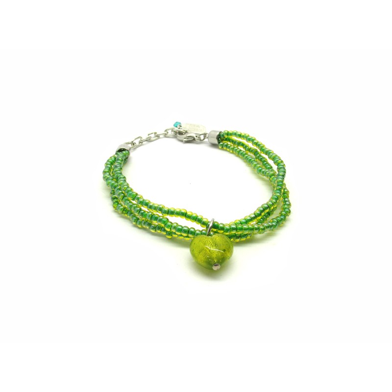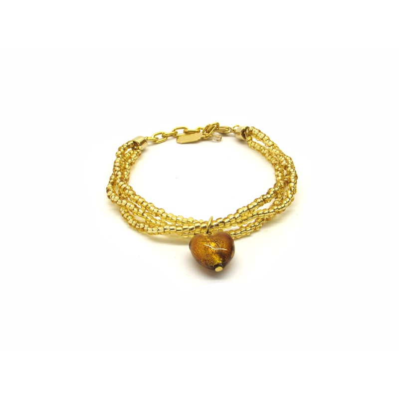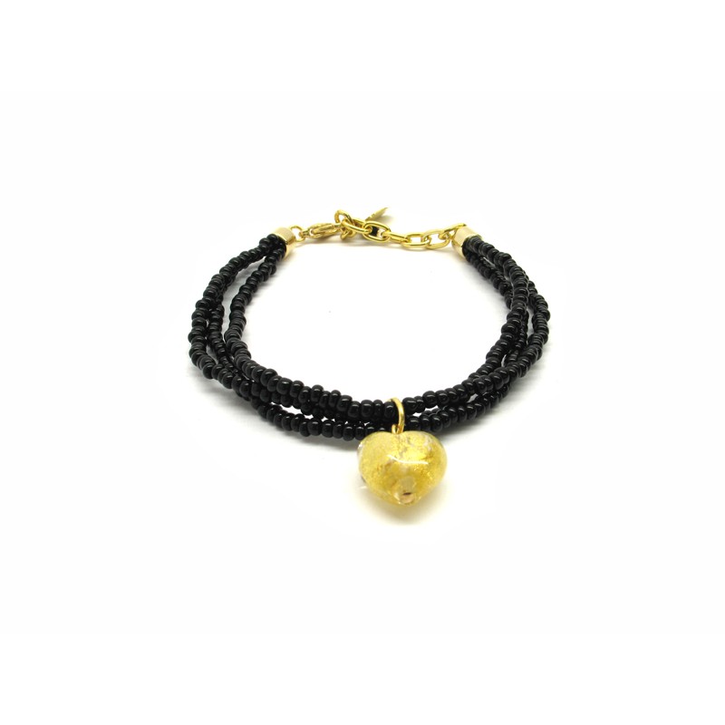 Murano Glass Bracelet, Mod. Giulia (21 cm) made with a Heart beads (13x9) and 3 wires, seed beads (conteria) necklace, available in 6 colours, with insertions foil, in Silver 925 and Gold 24 kt, made entirely handmade by Murano master glass-makers with the lampwork technique, in our Factory in Murano Venice - Italy.
