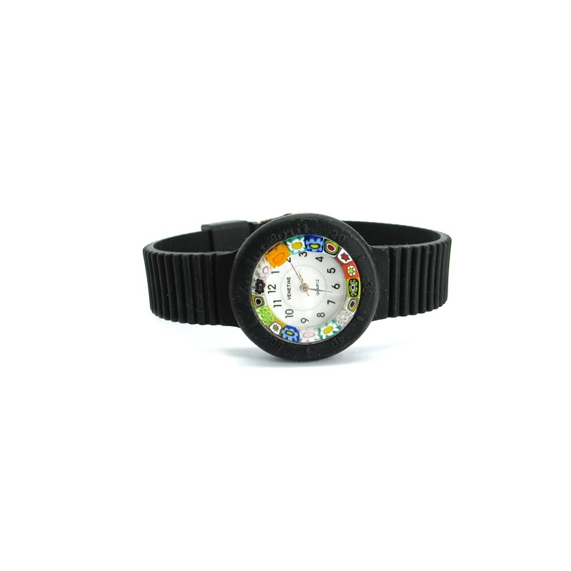 Murano millefiori watch, rubber Strap, Orange color, with original Murrina face in Millefiori Multicolor, straps and case available in 16 different colours, Quartz movement (Seiko) and case in soft Rubber, made entirely handmade by Murano master glass-makers with the the Murrina's Glass technique, in our Factory in Murano Venice - Italy.