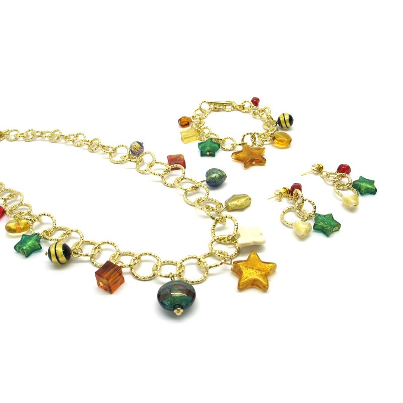 Murano Glass Set Mod. Charms - Long (100 cm) made with assorted beads, and Bracelet (20 cm) and Earrings (4 cm) available in Plating Gold and Chrome aluminum, made entirely handmade by Murano master glass-makers with the lampwork technique, in our Factory in Murano - Italy, with beads in silver 925 foil and 24 kt gold foil.
