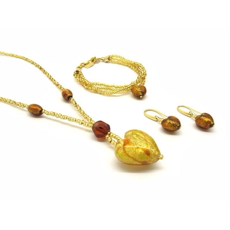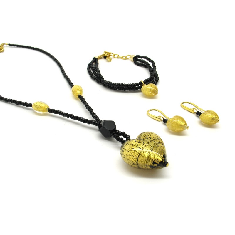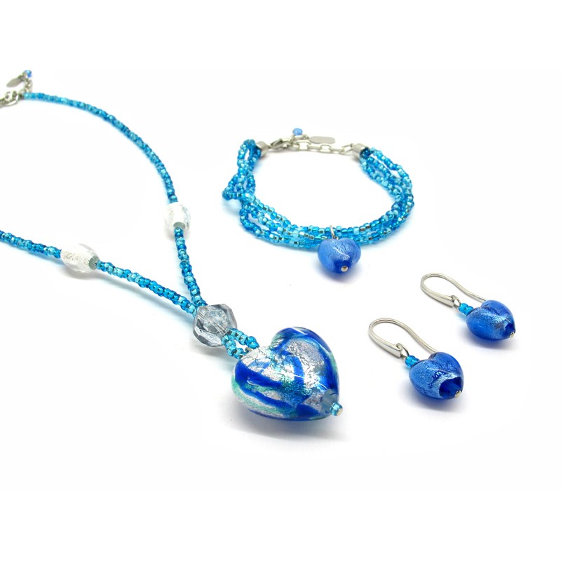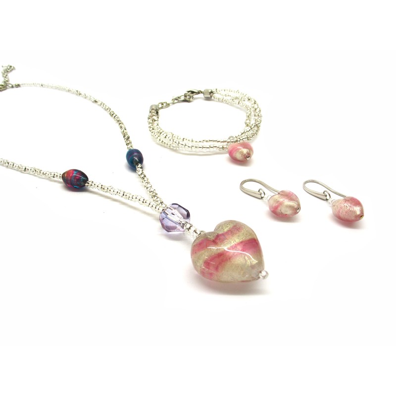 Murano Glass Set Mod. Giulia with Heart (26x16), made with a seed beads (conteria) necklace (45 cm), and Murano Glass Bracelet (20 cm) made with a Heart bead (13x9) and 3 wires, seed beads (conteria) and Murano Glass Earrings made with Heart beads (13x9) available in 6 colours, made entirely handmade by Murano master glass-makers with the lampwork technique, in our Factory in Murano - Italy, with beads in silver 925 foil and 24 kt gold foil.