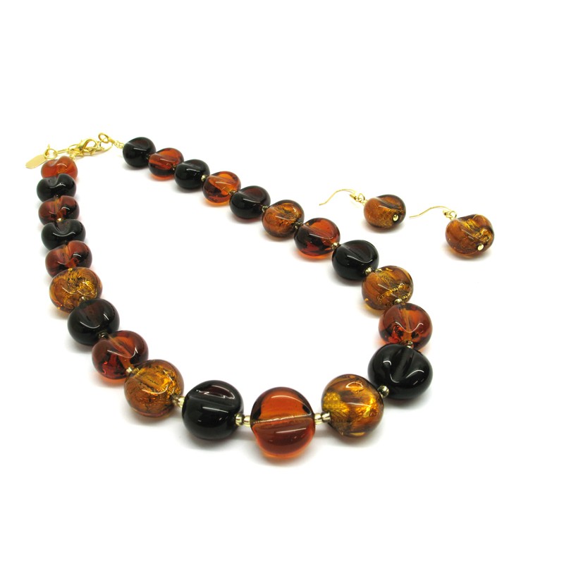 Parure in vetro di Murano Mod. Ancora, con Alba (50 cm) e Orecchini (16 mm) disponibile in 4 colori, realizzata interamente a mano dai maestri Vetrai Muranesi, con la tecnica della lavorazione a Lume nella nostra fabbrica a Murano, con perle in foglia Argento 925 e foglia Oro 24 kt.