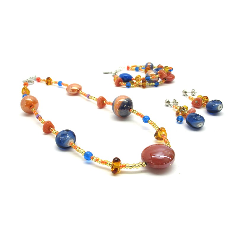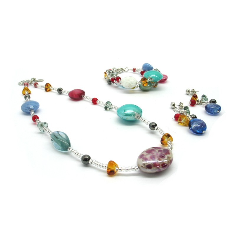 Parure in vetro di Murano Mod.Elena, con Collana (50 cm) in perle assortite (20 mm) Bracciale a tre fili (21 cm) e Orecchini (5 cm) con perle assortite (14 mm) disponibile in 4 colori, realizzata interamente a mano dai maestri Vetrai Muranesi, con la tecnica della lavorazione a Lume nella nostra fabbrica a Murano, con perle in foglia Argento 925 e foglia Oro 24 kt.