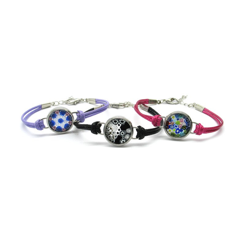 Bracciale in Vetro di Murano, Mod. Paolina (21 cm) con cassa in metallo cromato con Murrine assortite, e cinturino in cotone cerato, disponibile in 14 Colori Assortiti, prodotto e realizzato interamente a mano dai Maestri Vetrai Muranesi con la tecnica della lavorazione lume, nella nostra Fabbrica a Murano - Venezia.