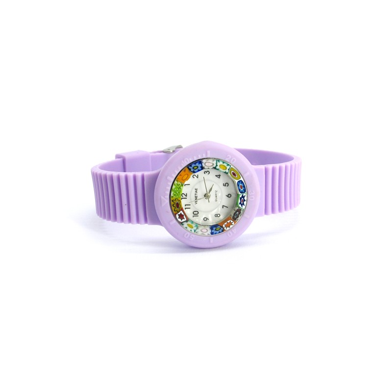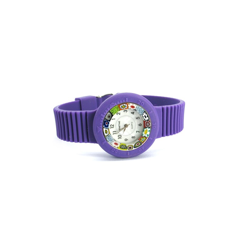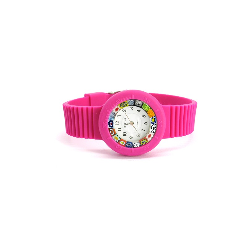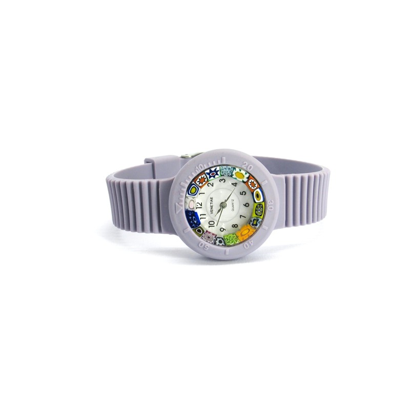 Orologio di Murano con vetro di Murrina Veneziana Multicolor (Cassa Diam 32 mm), cinturini Assortiti, disponibile in 16 colori, movimento al Quarzo (Seiko) Cassa e Cinturino in morbida Gomma. prodotto e realizzato interamente a mano dai Maestri Vetrai Muranesi con la tecnica della lavorazione a Murrina, nella nostra Fabbrica a Murano - Venezia.