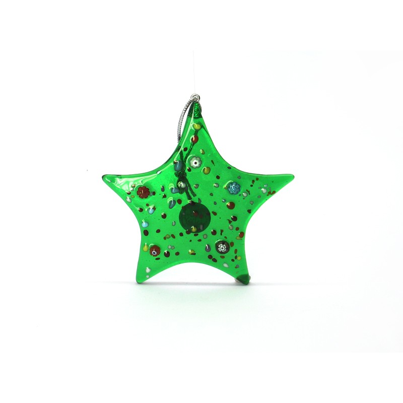 Pendentedi Natale in vetro di Murano, Mod. Stella, Diam. 85x85 mm, disponibile in Colore Verde, prodotto e realizzato interamente a mano dai Maestri Vetrai Muranesi con la tecnica della lavorazione a Piastra, nella nostra Fabbrica a Murano - Venezia.