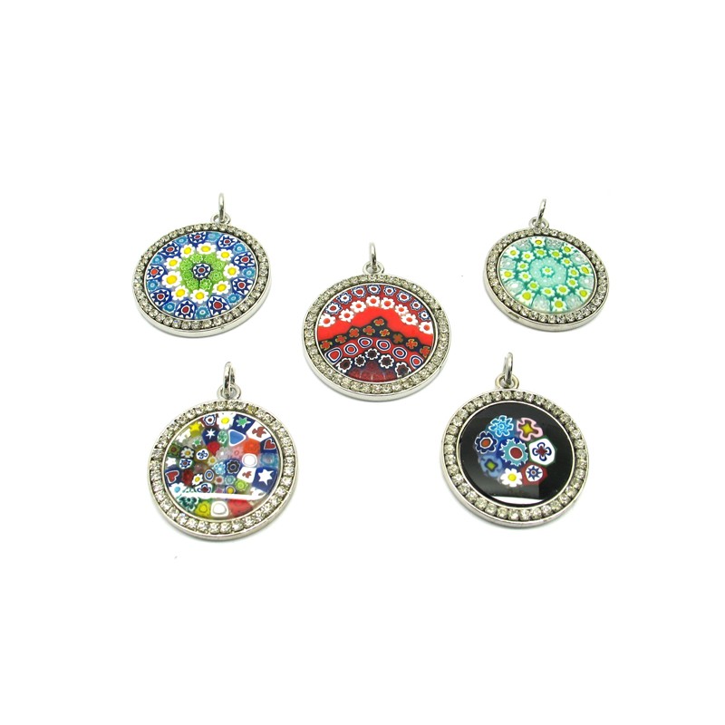 Pendente in Metallo con Murrina e Strass - Mod. MS-26(Diam. 26 mm) disponibile in 5 Colori assortiti, prodotto e realizzato interamente a mano dai Maestri Vetrai Muranesi con la tecnica della lavorazione a Murrina, nella nostra Fabbrica a Murano - Venezia.