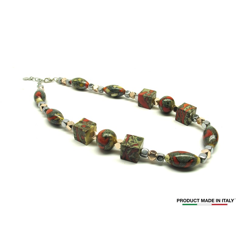 50 % di Sconto - Collana in Vetro di Murano, Mod. Petra (45 cm) con Perle lucide assortite in diverse misure, disponibile in colore Multicolor, con inserti in foglia Argento 925 e Oro 24 Kt, prodotta e realizzata interamente a mano dai Maestri Vetrai Muranesi con la tecnica della lavorazione lume, nella nostra Fabbrica a Murano - Venezia.